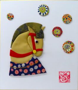 古い着物のはぎれを使い、来年の干支「午(うま)」の押絵の色紙飾りを作ります。【作品見本】